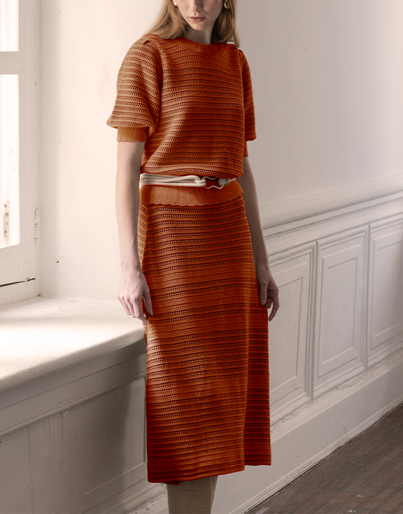 Full-length skirt knitted with a beautiful pattern in contrasting colors. A lovely wavy detail at the waistband adds a feminine and romantic touch.