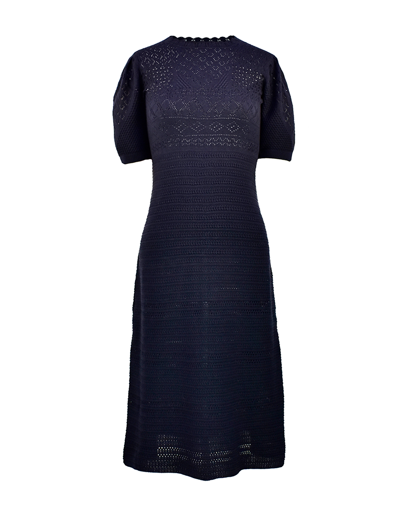 Dress knitted with the freshest, softest, and most comfortable organic cotton. The dress features a beautiful openwork knit pattern that complements the feminine silhouette, creating a romantic and modern style perfect for this season.