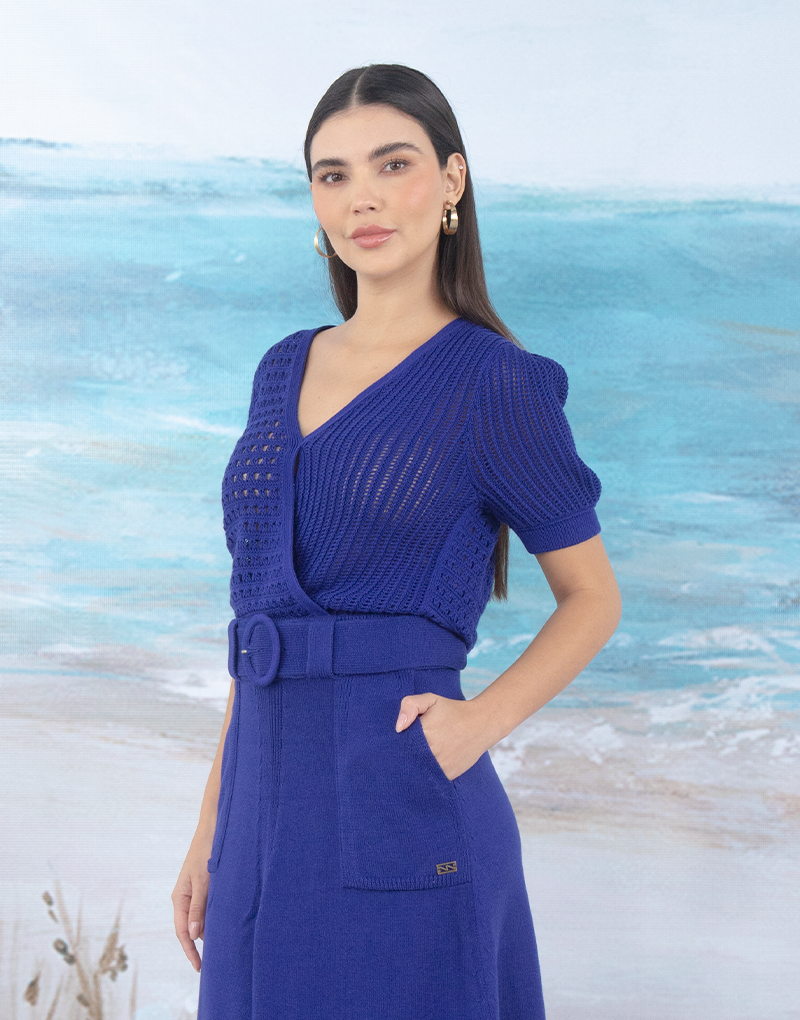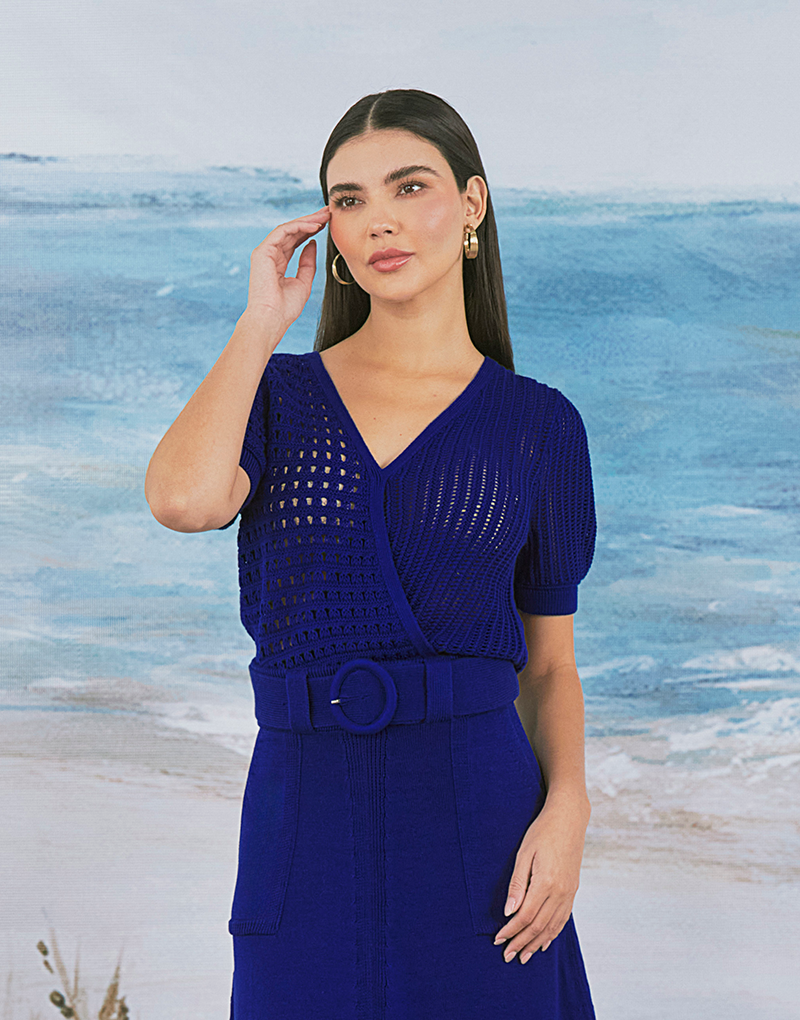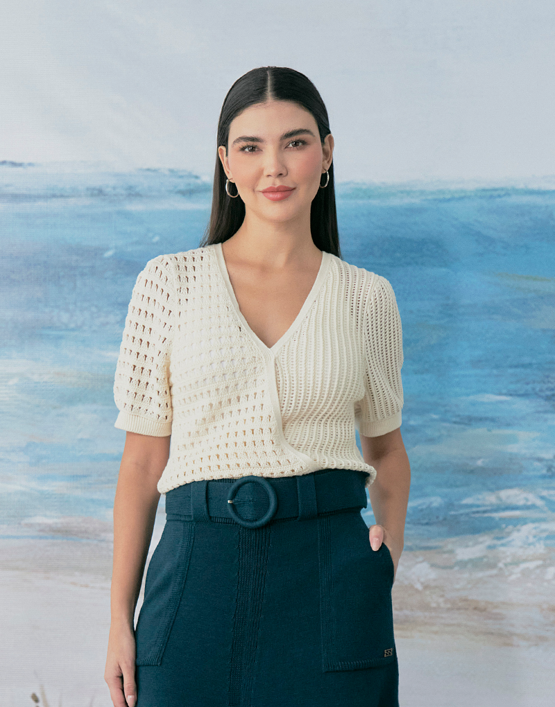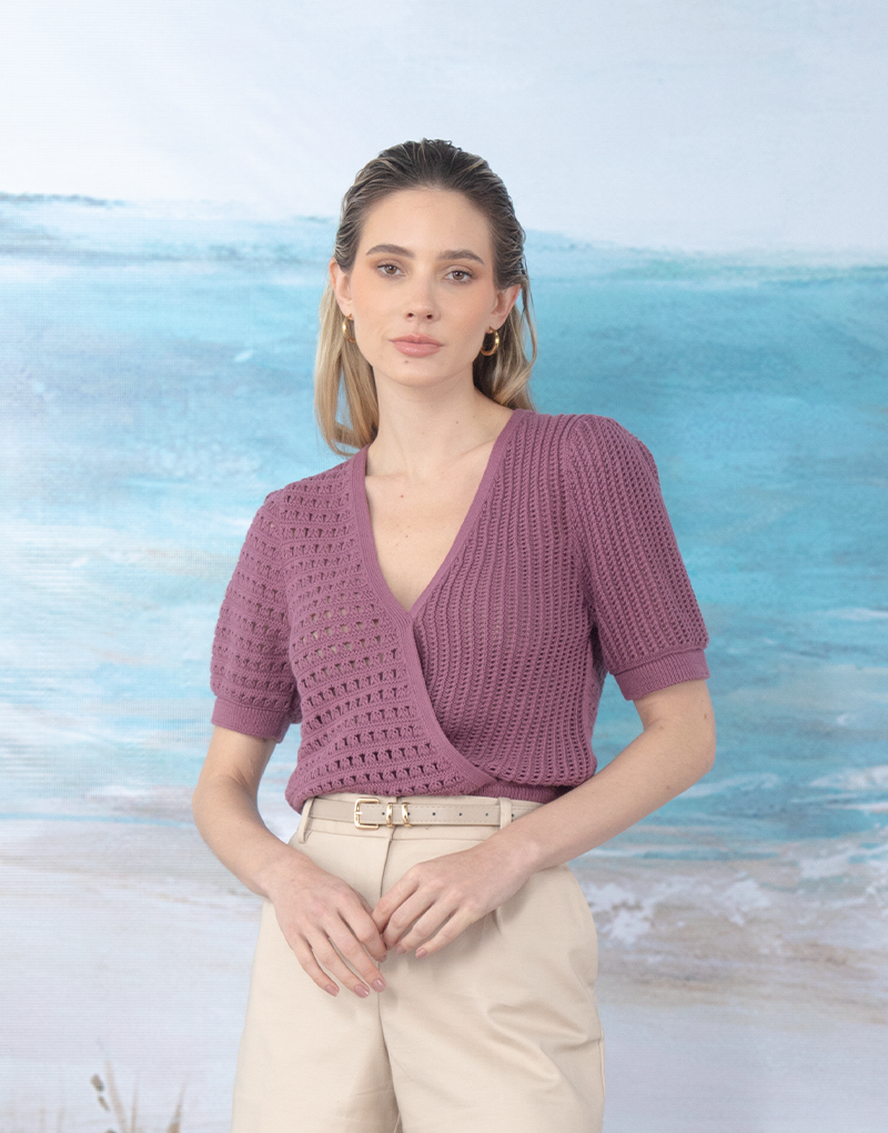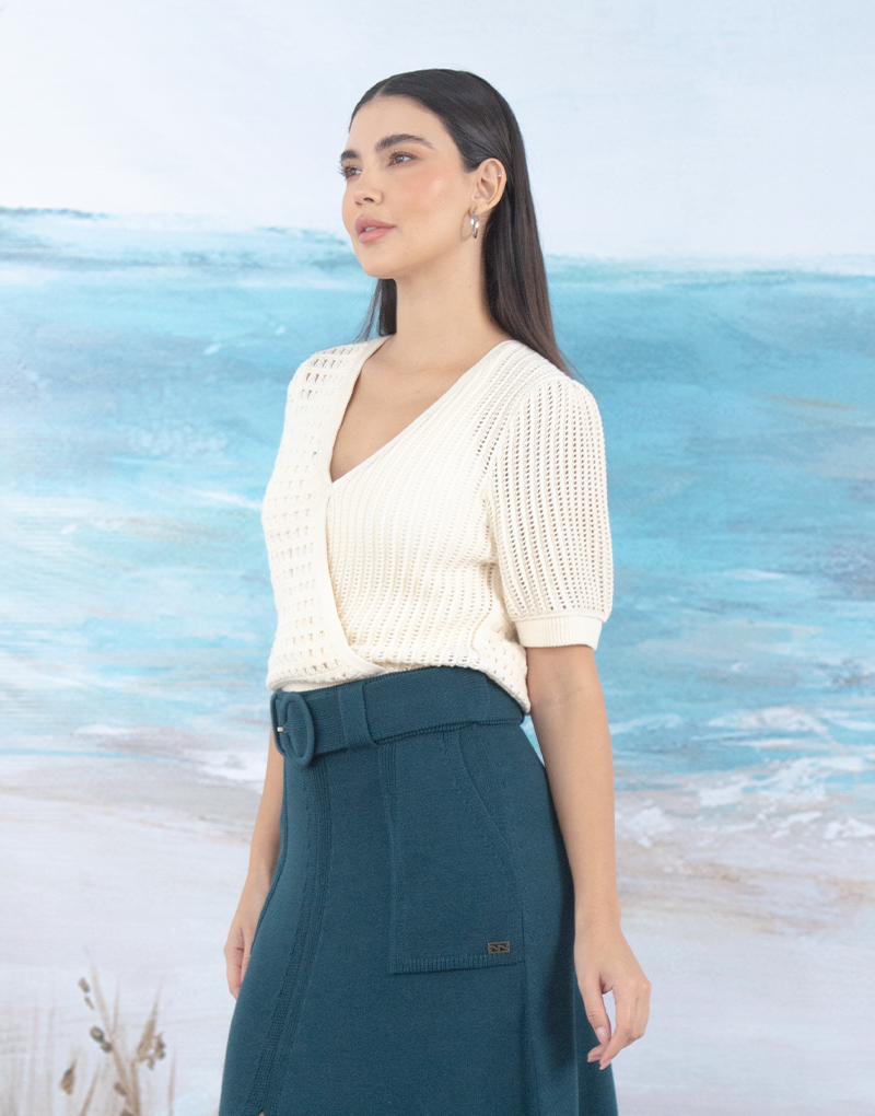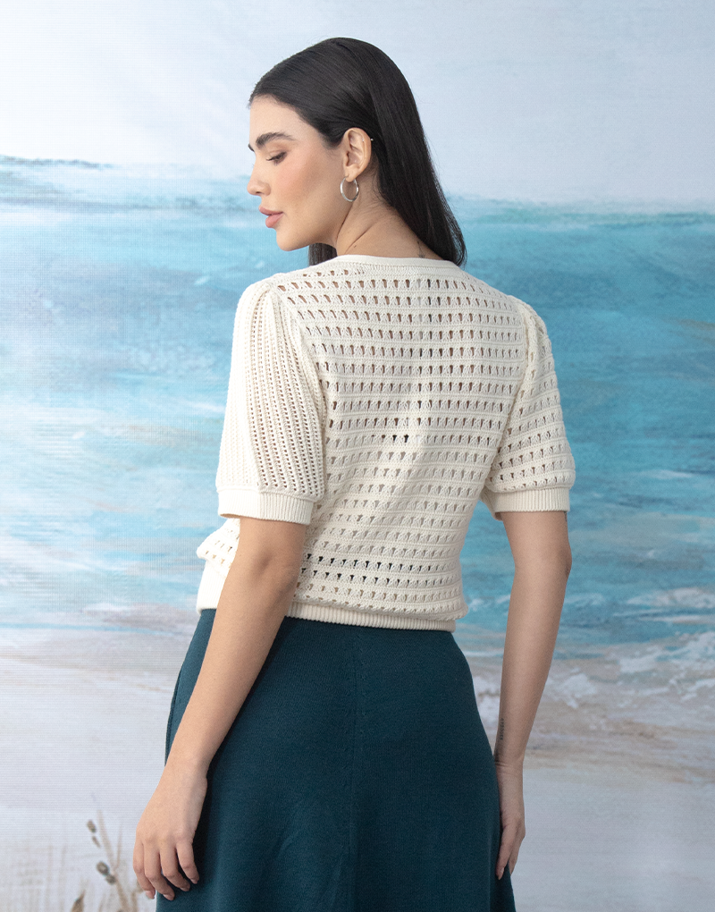 Suéter tejido, escote cruzado profundo y mangas abullonadas. Detalle de dos hermosos tejidos Pointelle, que aportan un look delicado y romántico. Tejido en el más suave y fresco algodón orgánico, ideal para lucirlo esta temporada.